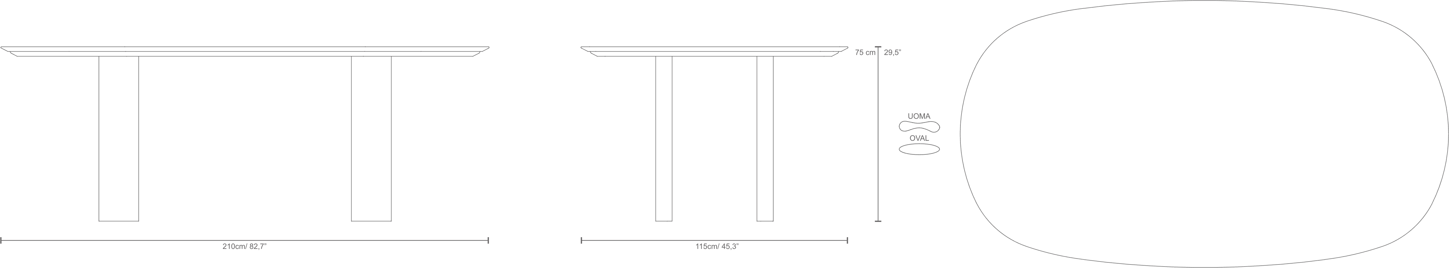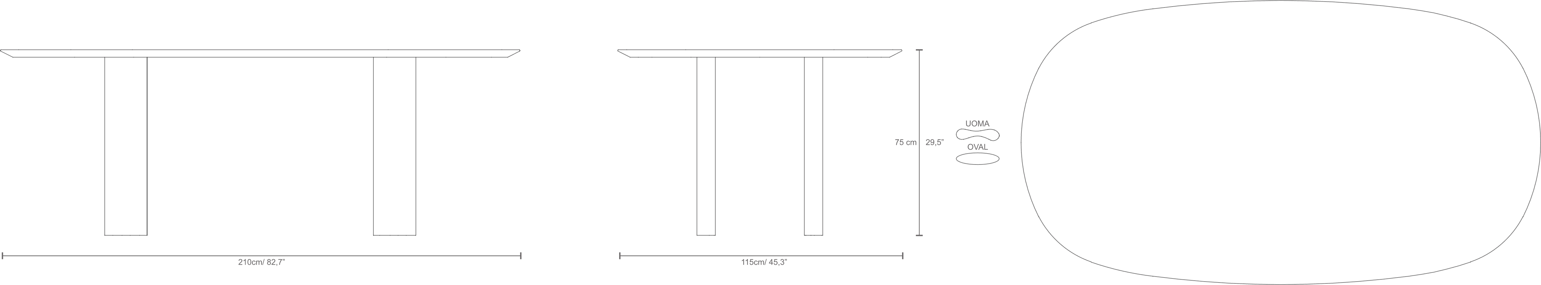 Table top size: 2100 x 1150mm Two alternative leg profiles: Uoma and Oval Height: 750mm