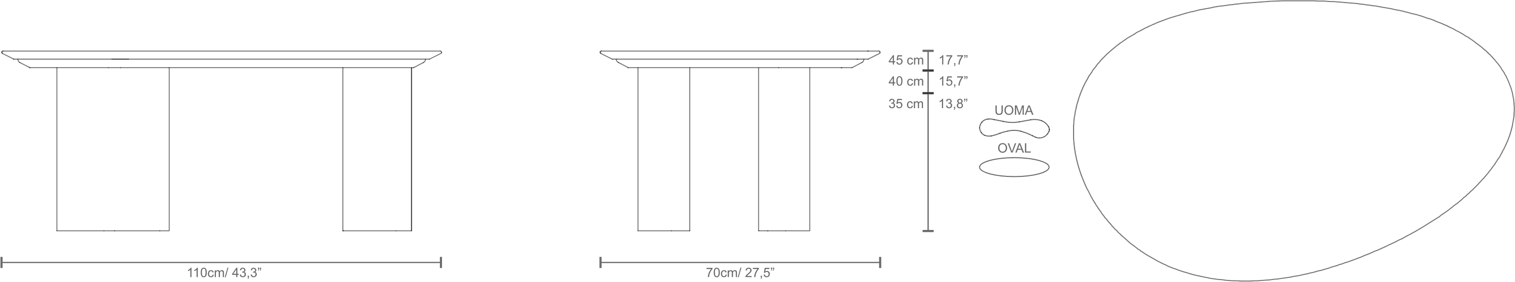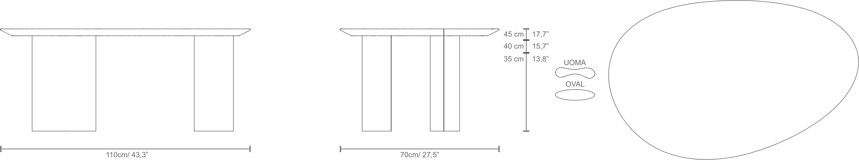 Table top size: 1100 x 500mm Two alternative leg profiles: Uoma and Oval Three alternative heights: 350mm, 400mm and 450mm