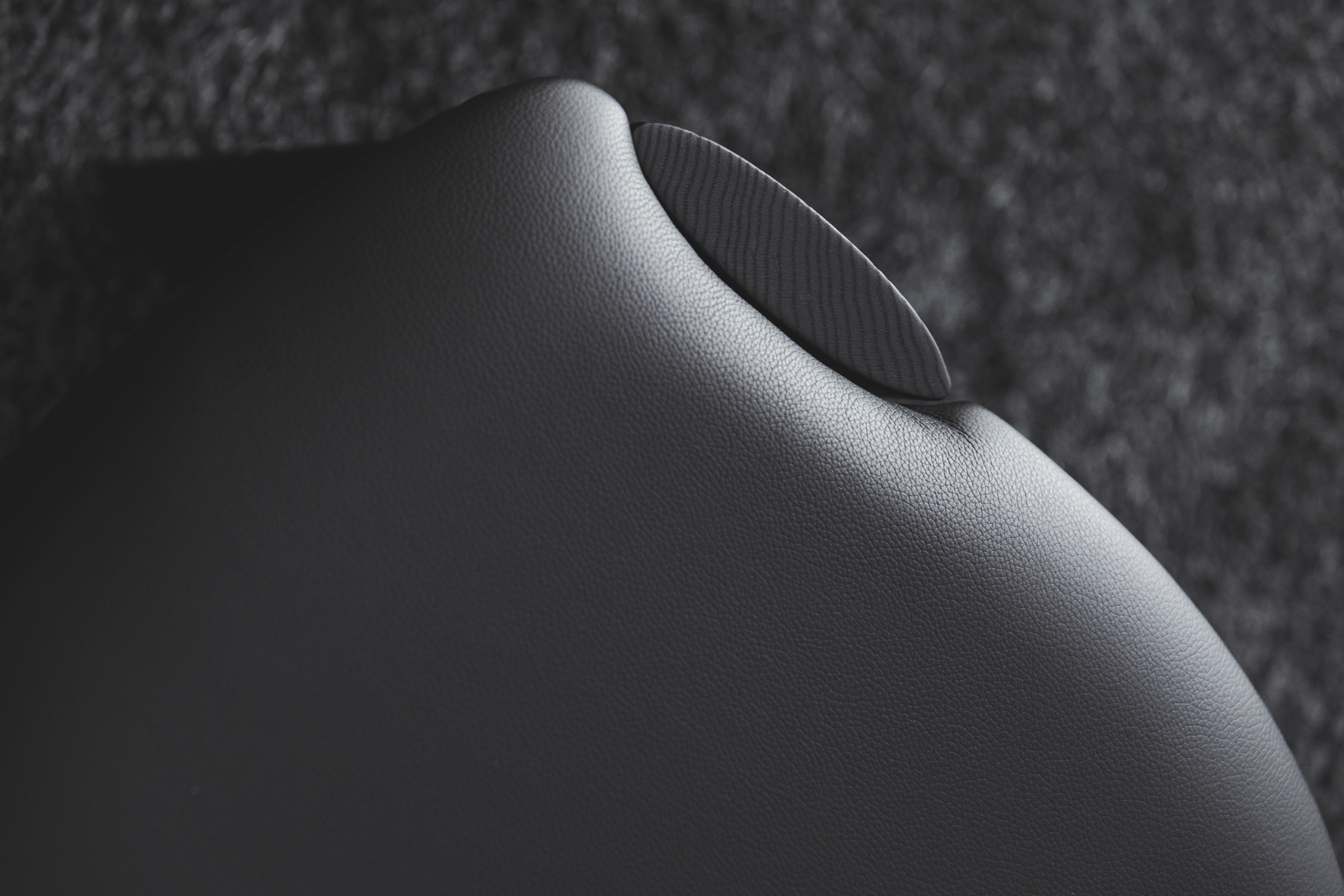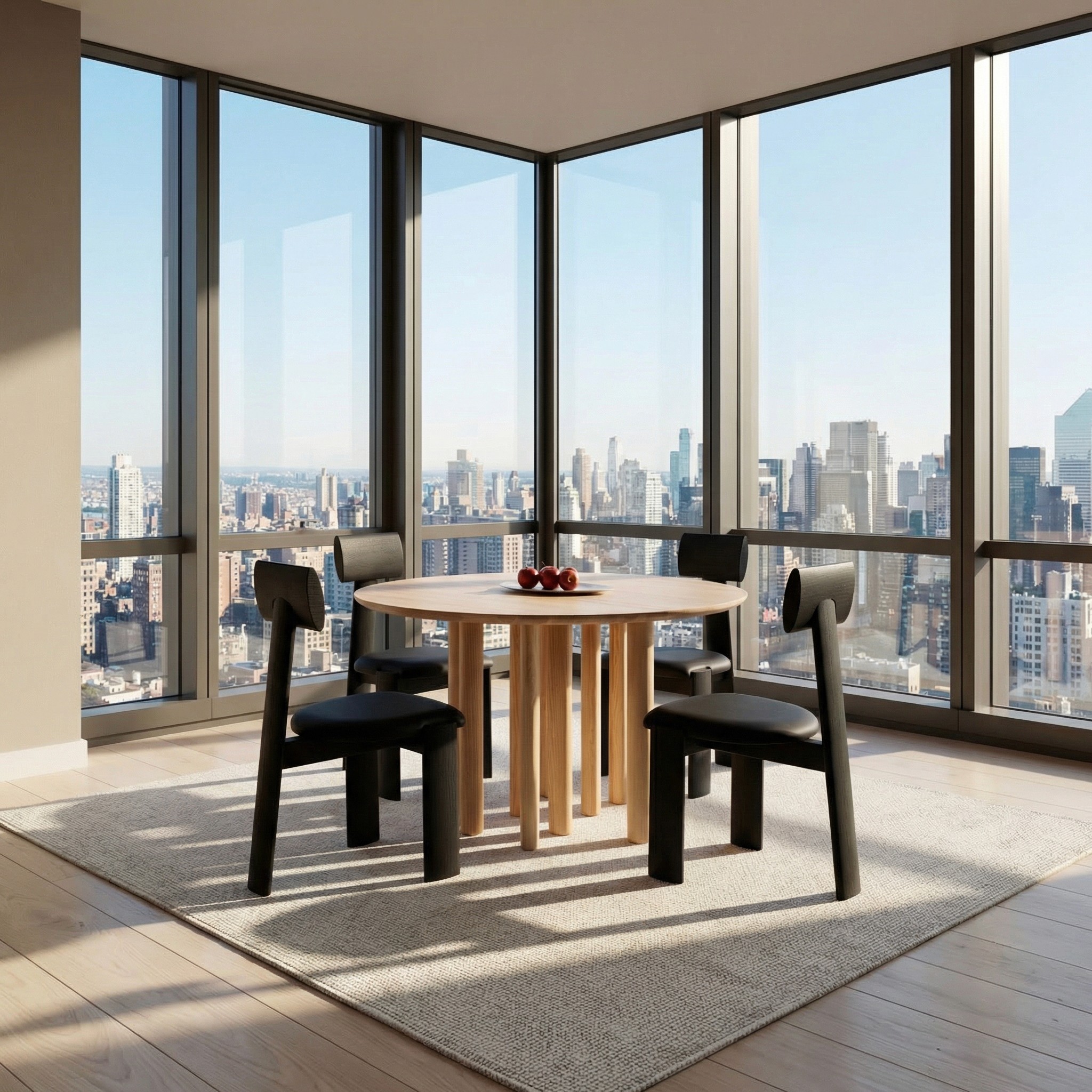 Upholstered seat adds comfort without bulk, offered in tactile bouclé fabric or structured embossed leather; both selected for the warm texture and longitivity. Mantis is made for dining, but it reads equally well around a meeting table—functional, sculptural, and built to last.