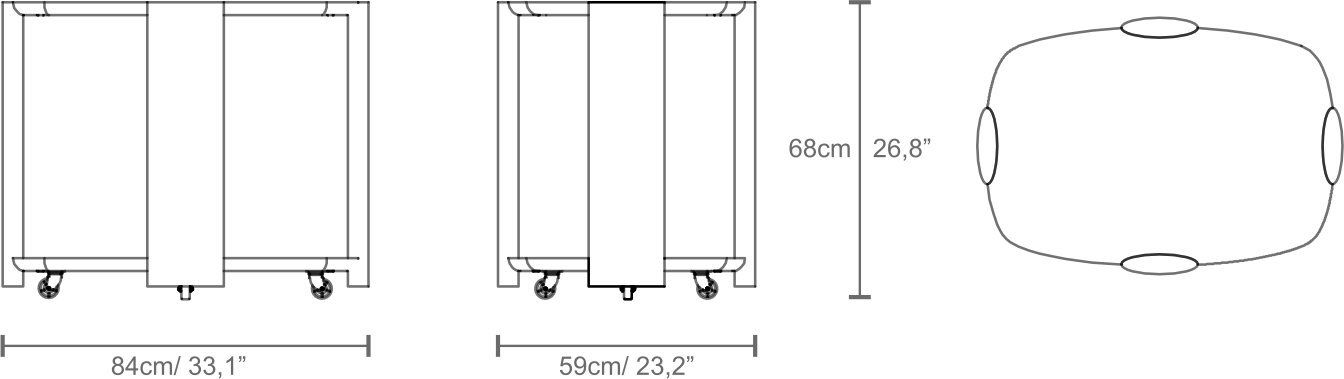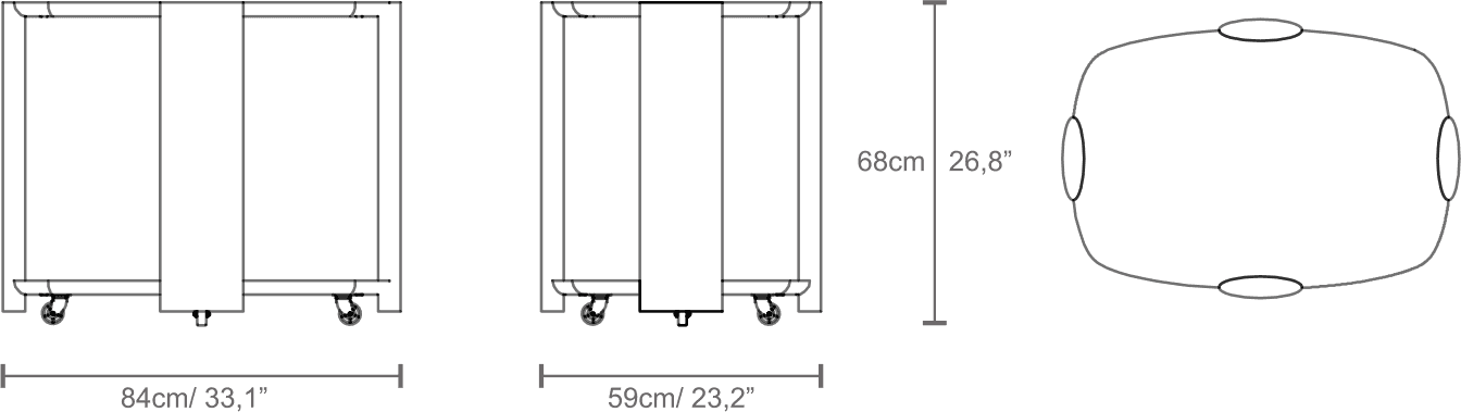 Two oval shaped tops: 790 x 540mm Height: 680mm Four wheels, turning 360 degrees, at the base