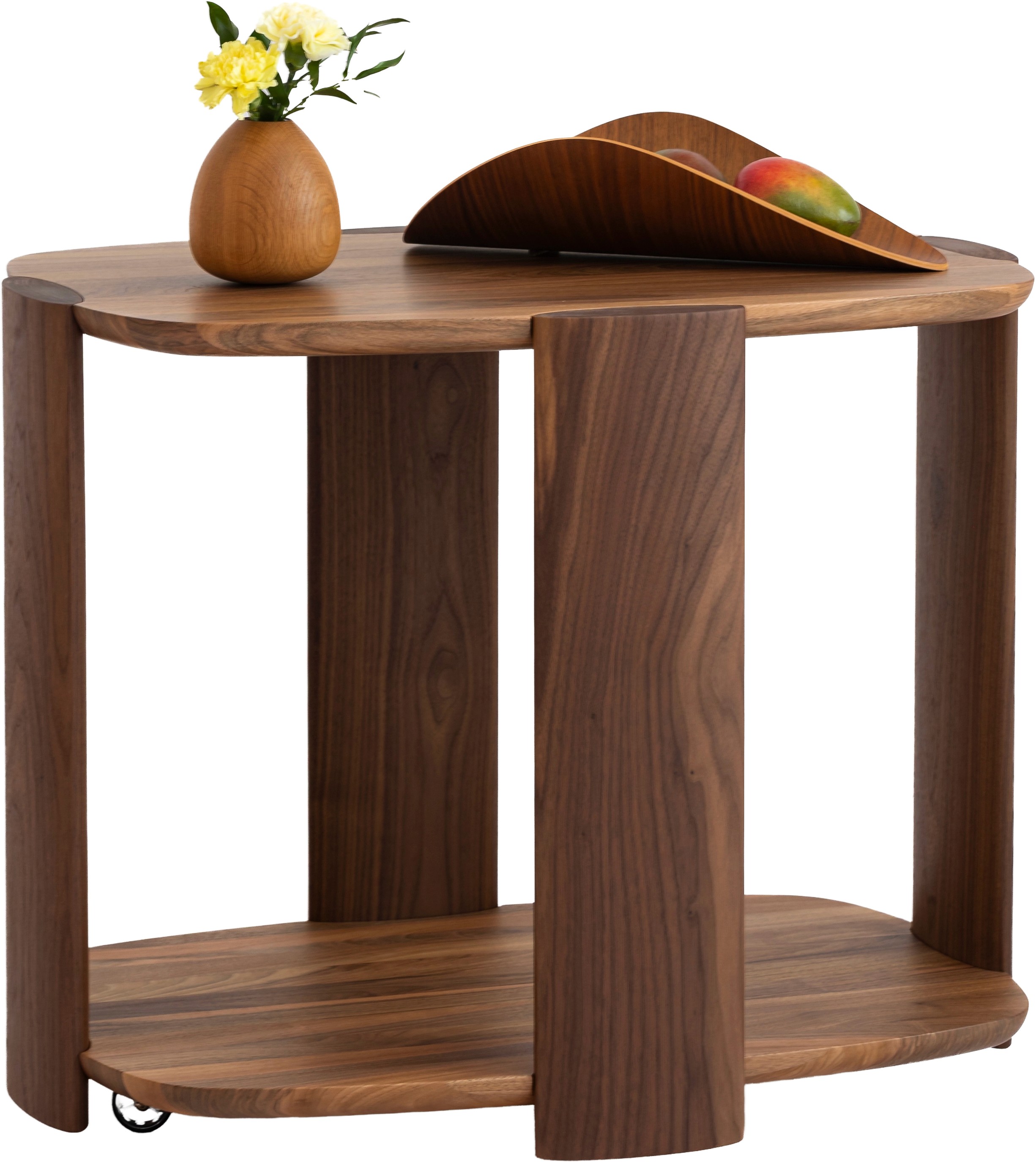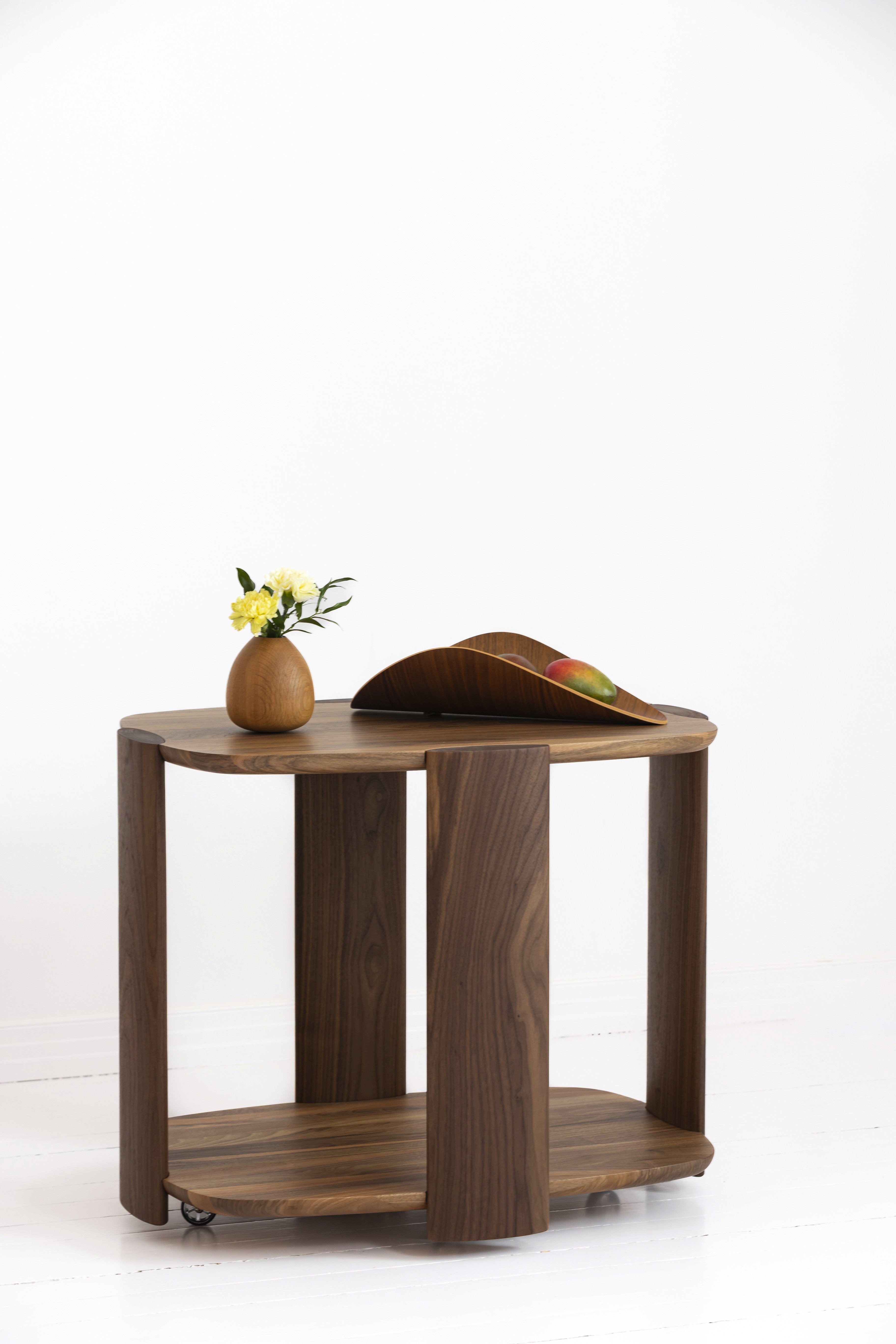 The trolley is defined by rounded slab shelves, and oval pillars, that gives the object its quiet spine. The geometry is gentle, but the construction is strict—Nordic restraint with human modernism.
