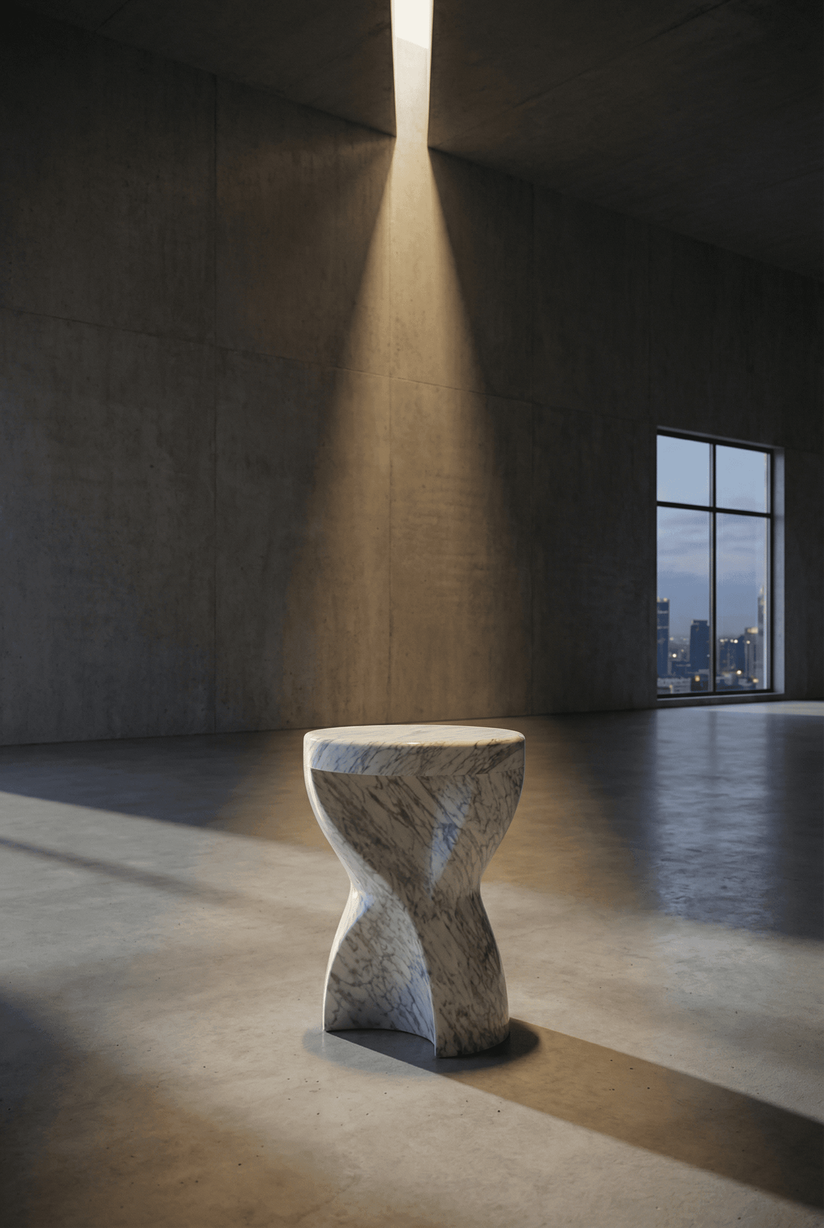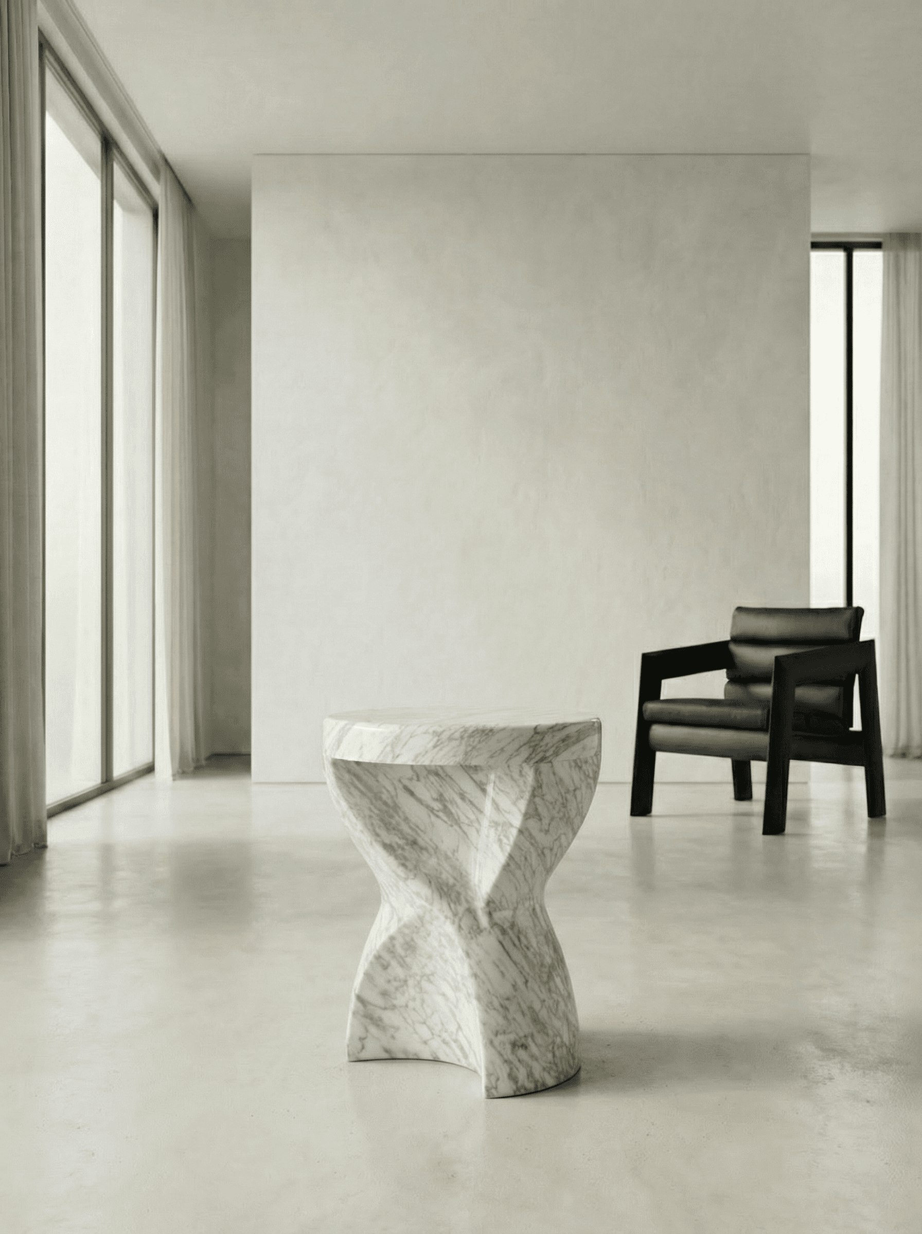 Vortex is a stool designed as organic architecture: a single carved volume shaped by rotation and calm restraint. The silhouette twists as it rises, creating a sense of movement without noise—Nordic restraint with human modernism, expressed in stone.